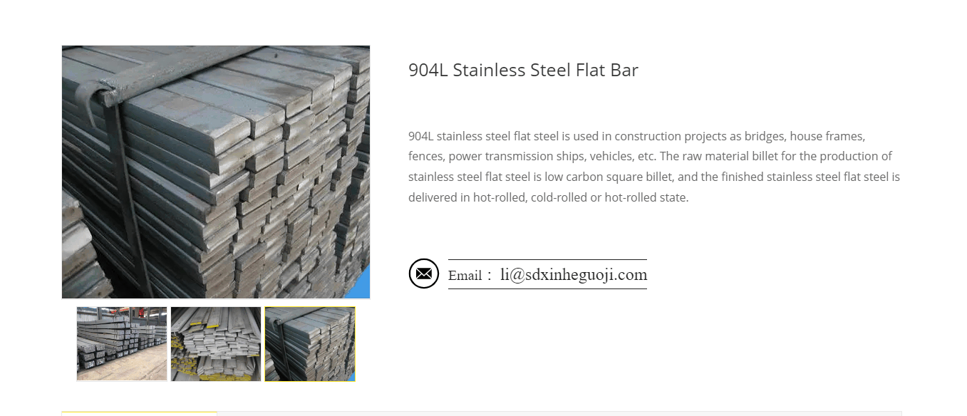 904L stainless steel flat steel is used in construction projects as bridges, house frames, fences, power transmission ships, vehicles, etc. The raw material billet for the production of stainless steel flat steel is low carbon square billet, and the finished stainless steel flat steel is delivered in hot-rolled, cold-rolled or hot-rolled state.