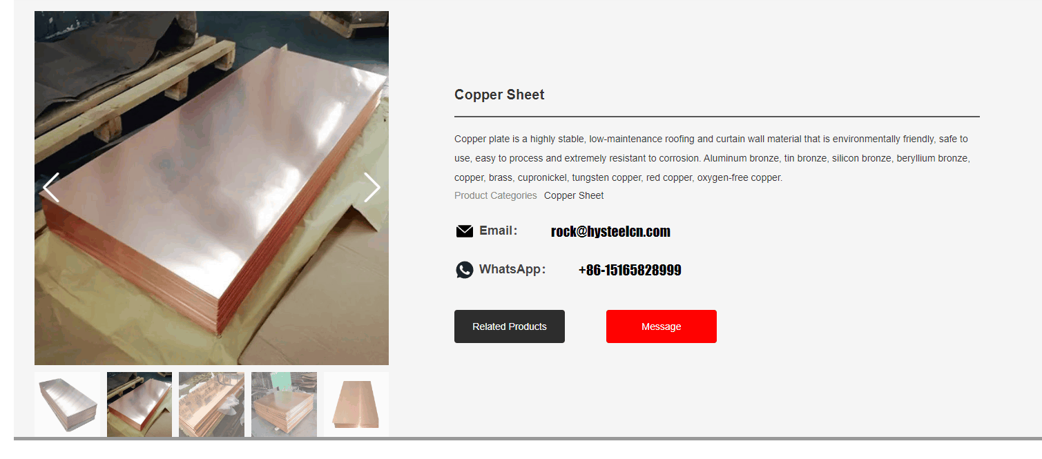 Copper plate is a highly stable, low-maintenance roofing and curtain wall material that is environmentally friendly, safe to use, easy to process and extremely resistant to corrosion. Aluminum bronze, tin bronze, silicon bronze, beryllium bronze, copper, brass, cupronickel, tungsten copper, red copper, oxygen-free copper.